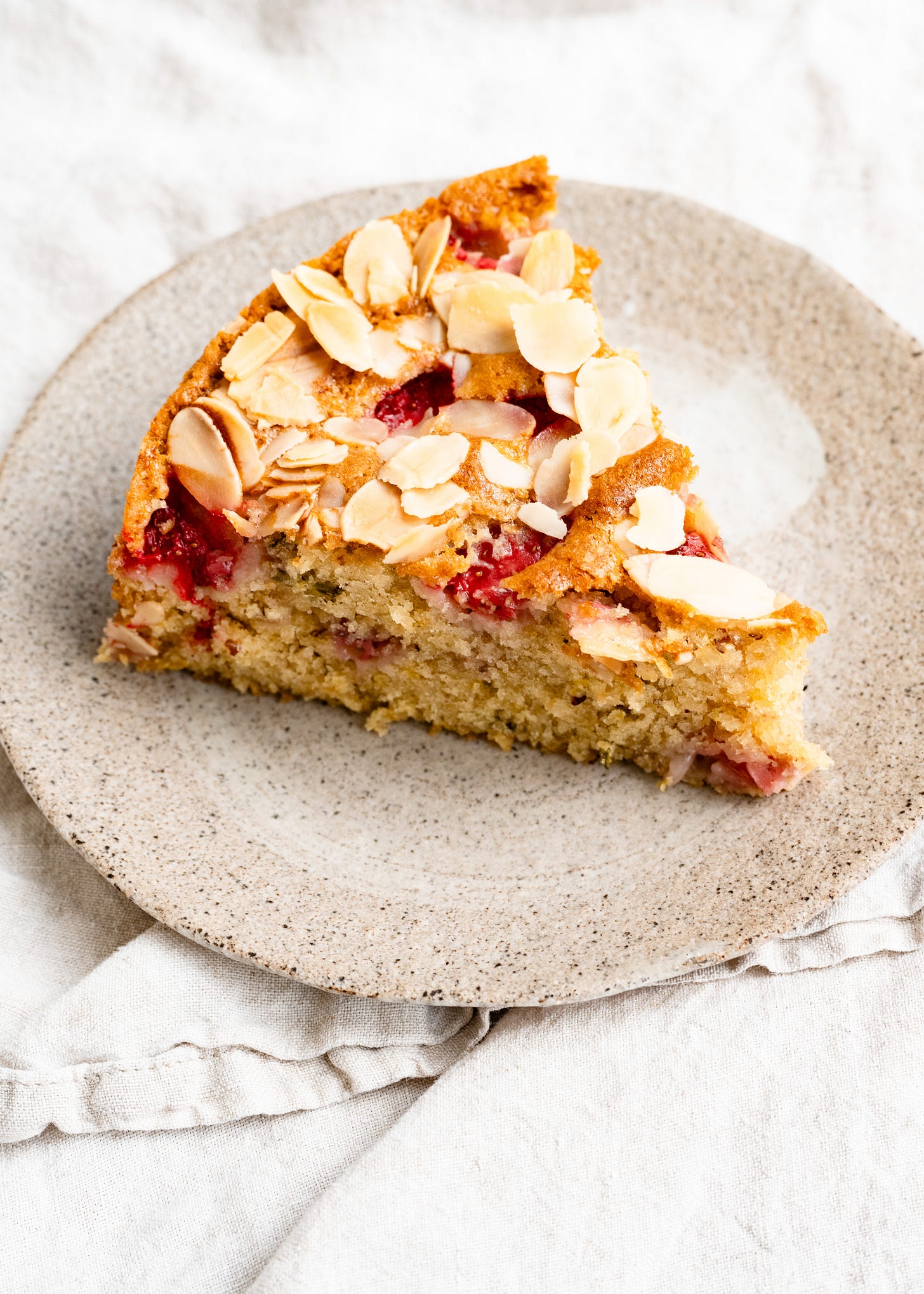 An easy one layer moist tea cake filled with raspberry liquor soaked strawberries, almond flour and slices of toasted almonds. Hints of fresh basil and lemon zest round out the flavors of this delicious spring cake recipe.